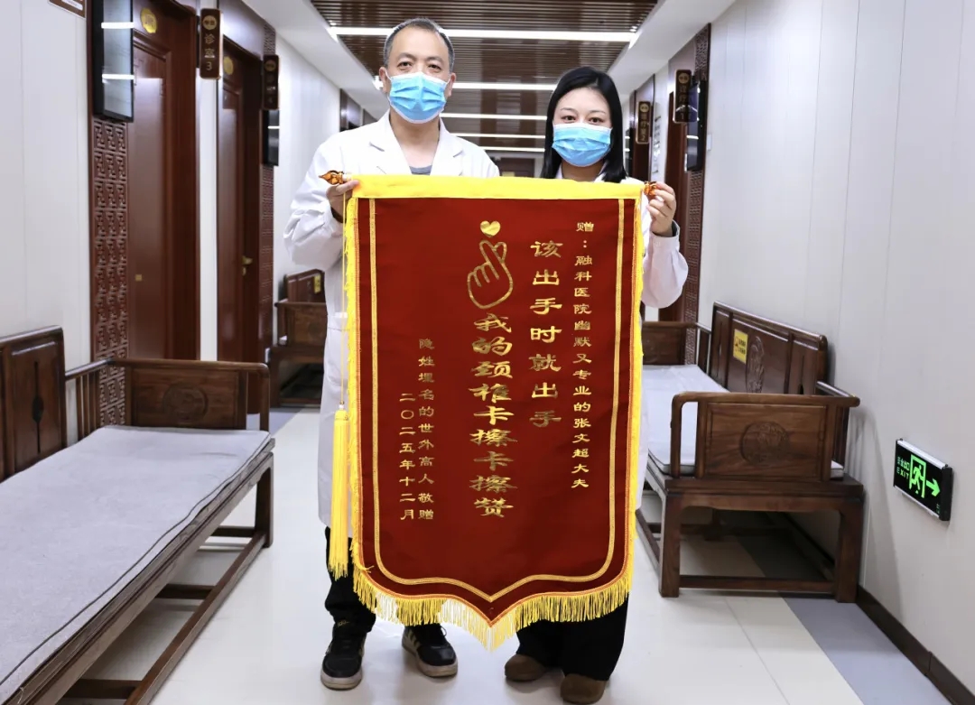 为此,张文超老师以推拿正骨、疏通经络为主,配合针灸温通调理,通过精准的手法调整,帮助错位关节慢慢复位,放松紧绷的肌肉与筋腱,再辅以针灸刺激相关穴位,调和气血、缓解疼痛。经过治疗,患者的头晕、腰酸等症状明显减轻,身体也轻松灵活了许多。由于近期出差在外,无法当面致谢,她便特意定制了这面生动有趣的锦旗寄到医院,以表感激之情。
