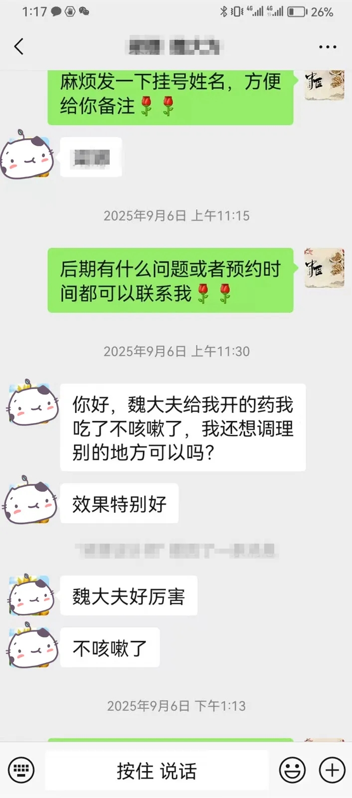 2025年8月,长期受咳嗽困扰的梁女士前来就诊,魏大为医生通过细致问诊与辨证,判断其属于气阴两虚、肝郁化火体质。基于整体调理的思路,魏大为医生为她制定了疏肝清热、宣肺止咳的综合调理方案,并耐心解释病因与调理方向。