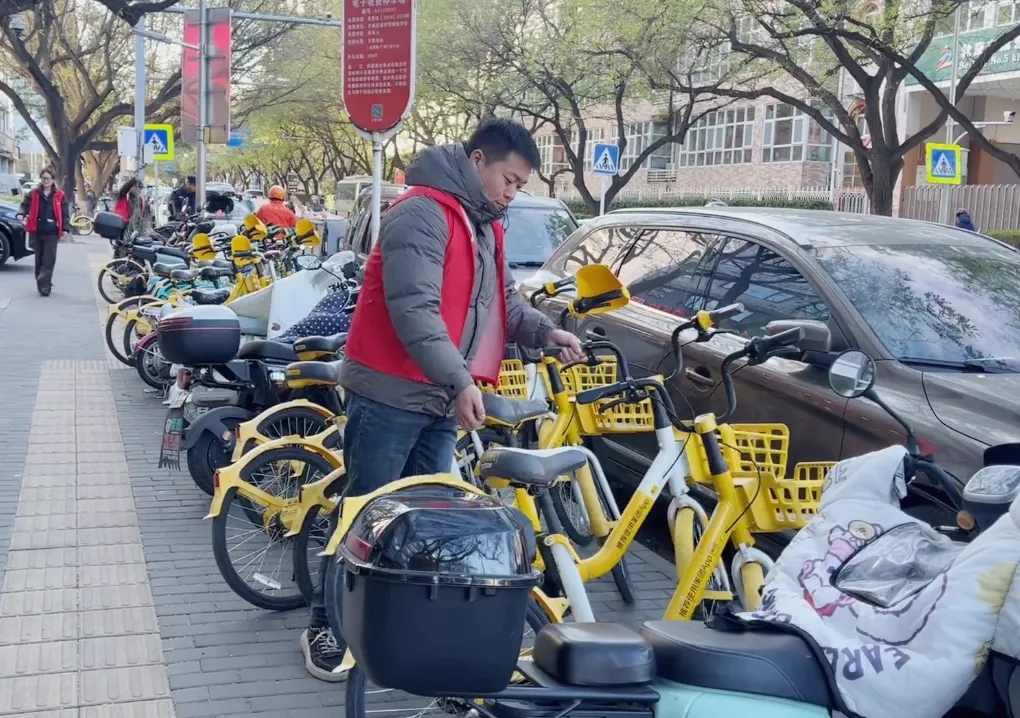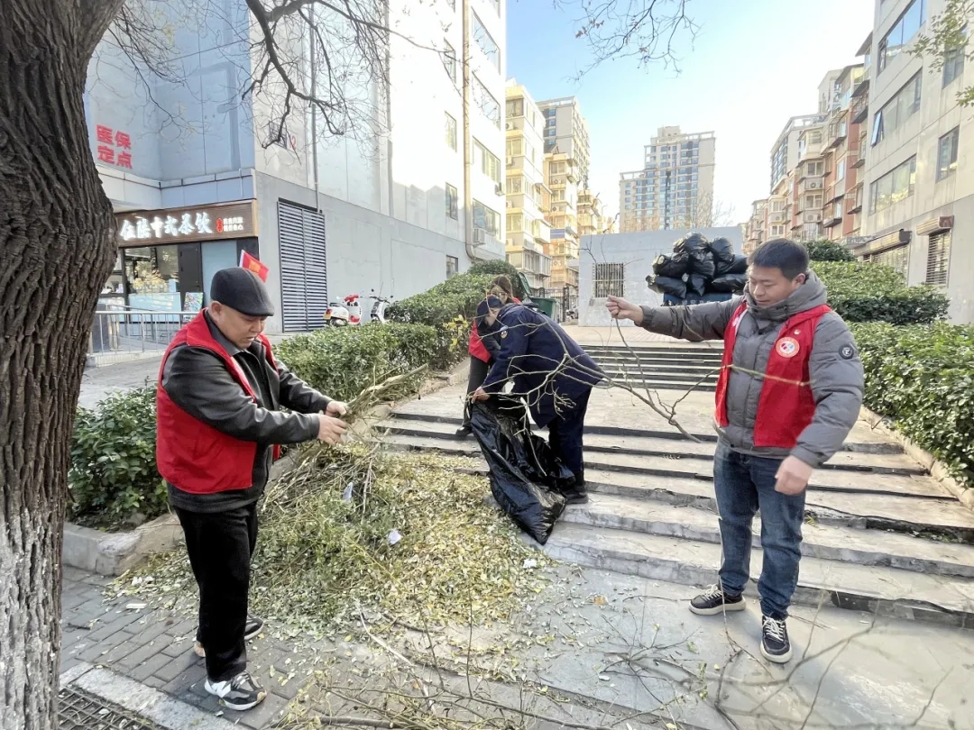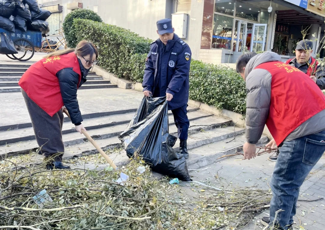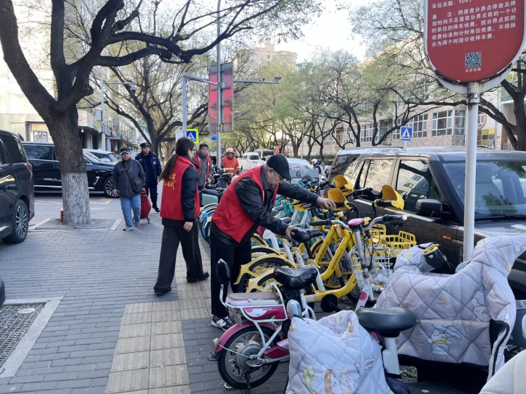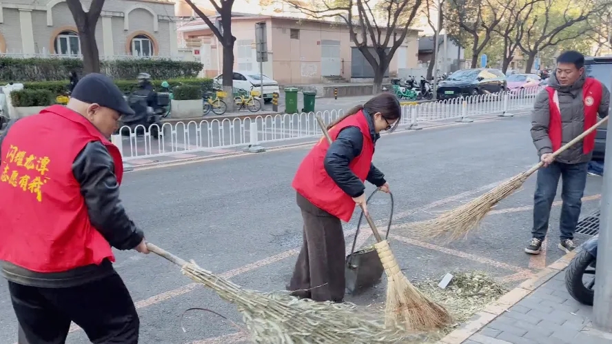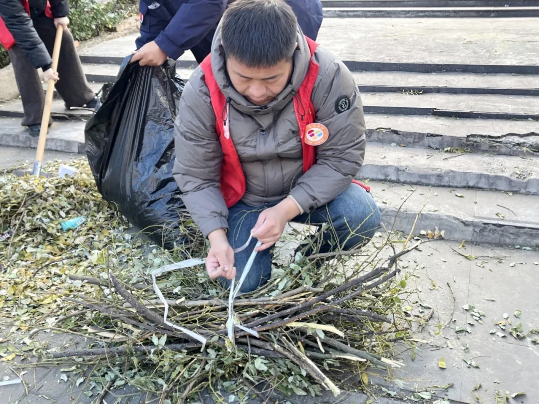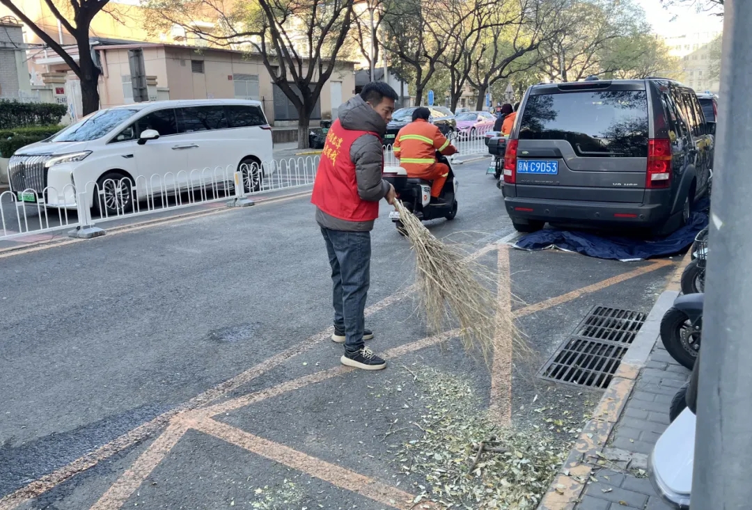 上午9时,党员志愿者们身着红色马甲,手持扫帚、簸箕和垃圾袋等工具准时集合。大家热情饱满,分工协作,先对主干道及停车场堆积的落叶进行全面清扫,确保路面畅通、行人安全;随后仔细清理台阶上的枯枝和白色垃圾,不放过任何一处卫生死角;最后,大家主动将院区周边散乱停放的共享单车一一扶正,整齐摆放到指定区域,有效改善了公共空间秩序。