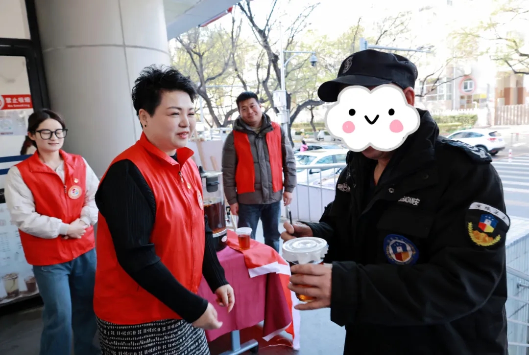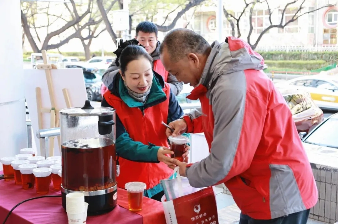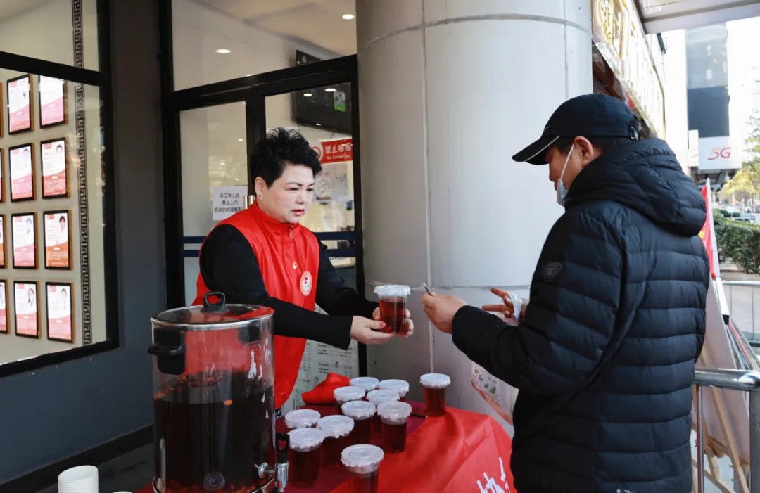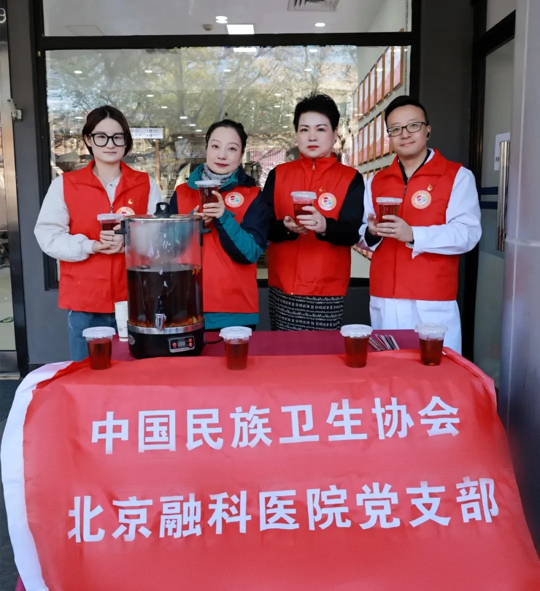 11月21日上午9时,在北京融科医院党支部书记胡霞的带领下,夏术刚、王玮、简秋婉等党员志愿者在医院门口设立爱心服务站,将一杯杯热气腾腾的姜枣茶送到户外工作者及过往行人手中,并叮嘱大家在寒冷天气中注意防寒保暖。