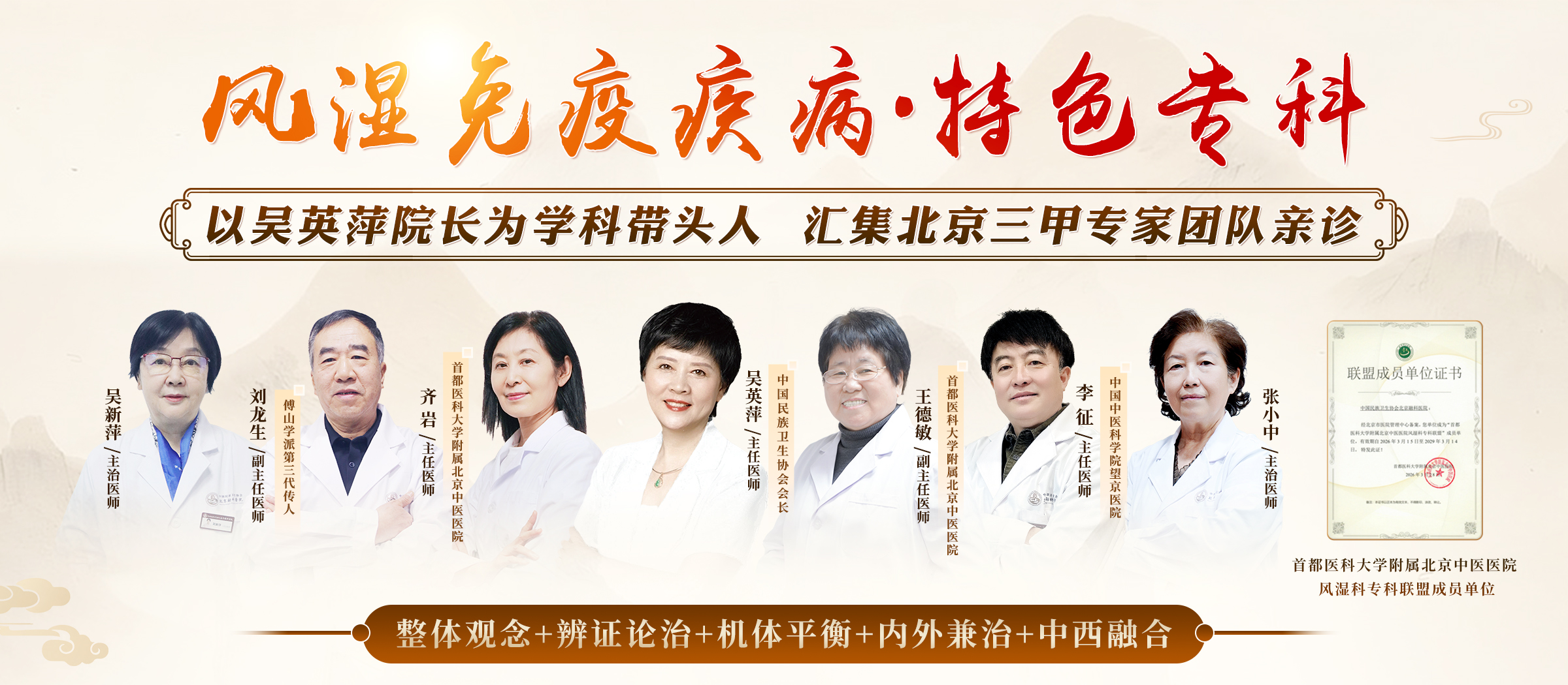 以吴英萍院长为学科带头人,汇集北京三甲专家团队联合坐诊,主要以中医药理论为基础,以辨证论治为原则,为风湿疑难病患者提供高水平的诊疗服务。