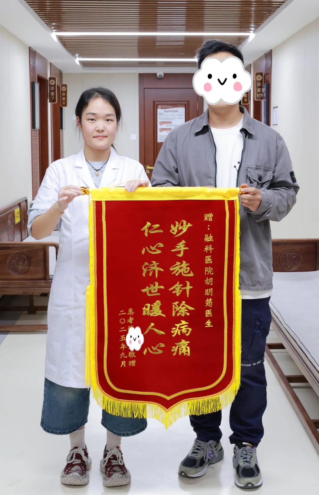 王玮医生为她制定了疏肝解郁、健脾和胃的调理方案,由理疗室胡明筠老师为其施以针灸治疗。经过一段时间的治疗,刘女士的胸闷明显好转,呼吸变得顺畅,情绪趋于平稳,面部痤疮也少了,特地送来锦旗表达感激之情。