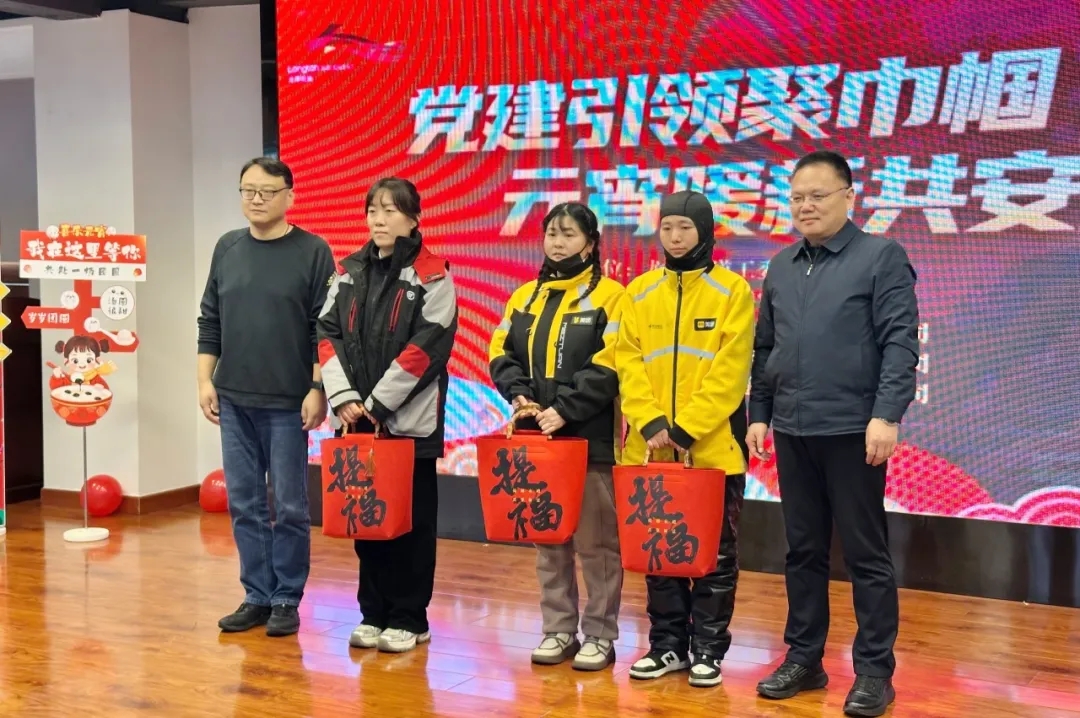 ▲龙潭街道工委书记王晓军(右)/龙潭街道工委副书记李洋(左)与新就业群体代表合影